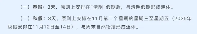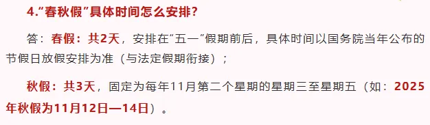 市教育局:经核实,春假、秋假各3天。原则上春假集中在4月,在每年国务院公布的清明假期前后,与清明假期形成连休;秋假集中在11月,在11月第二周(教学周)的后三天(周三至周五)与周末形成连休。