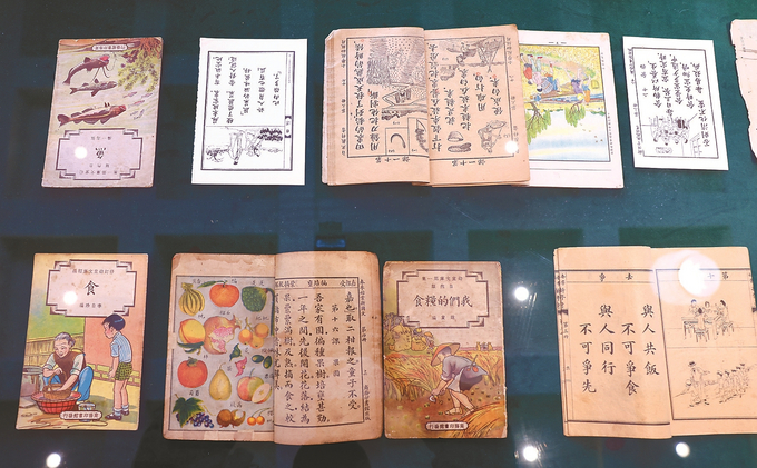 在这个单元,邓康延将大量印刷精美、图文并茂的老课本、老画册放进展柜,从衣、食、住、行四个角度还原生活中的美。很多书本上都有著名漫画家丰子恺先生的作品。在邓康延看来,丰子恺是最懂得美育的画家之一,他能够以温润、敦厚的姿态蹲下来,看着孩子们的眼睛,为他们作画,与他们共情。他的画,题材看似随手拈来,却透着稚子性情,葆有童气、拙气、烟火气。