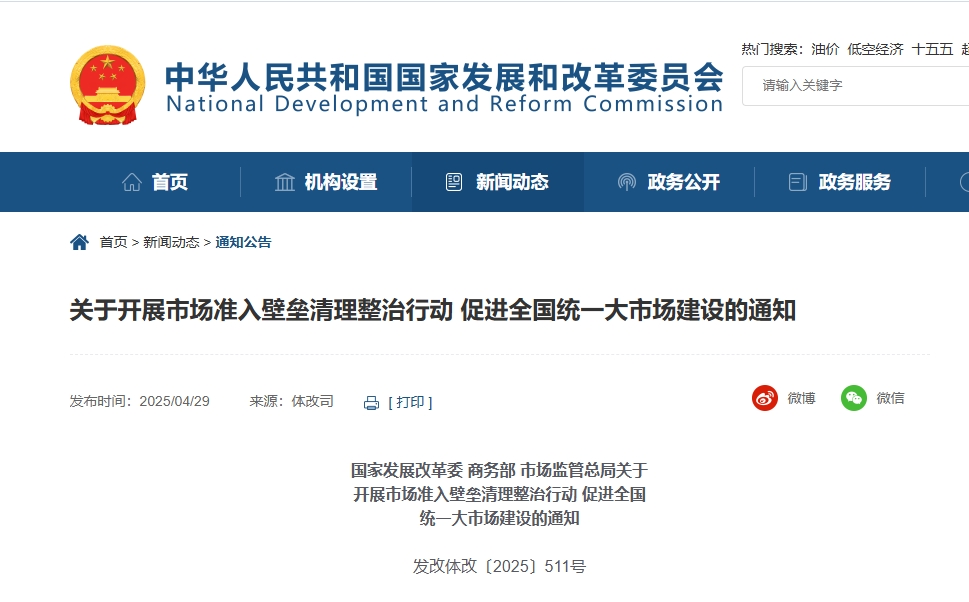 国家发展改革委、商务部、市场监管总局发布《关于开展市场准入壁垒清理整治行动 促进全国统一大市场建设的通知》。