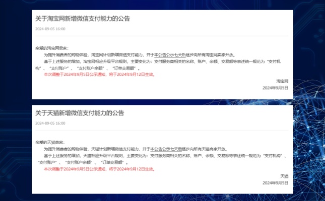 近日,淘宝发布《关于新增微信支付能力的公告》,宣布淘宝网接入微信支付。该公告将公示七天后,于9月12日逐步向所有淘宝网卖家开放。