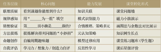 1.知识建构目标。学生能够准确识别周期排列规律,独立观察并描述先学单中图形排列的规律。能够完整描述余数解题模型,口头表述“余几找第几,无余找最后”的推理逻辑,如“19÷3=6(组)……1(面),第19面是第7组第1面,是黄旗”。