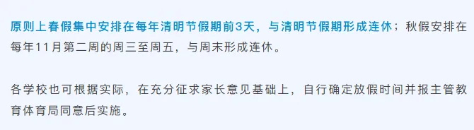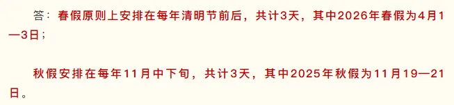 市教育局:经核实,春假、秋假各3天。原则上春假集中在4月,在每年国务院公布的清明假期前后,与清明假期形成连休;秋假集中在11月,在11月第二周(教学周)的后三天(周三至周五)与周末形成连休。