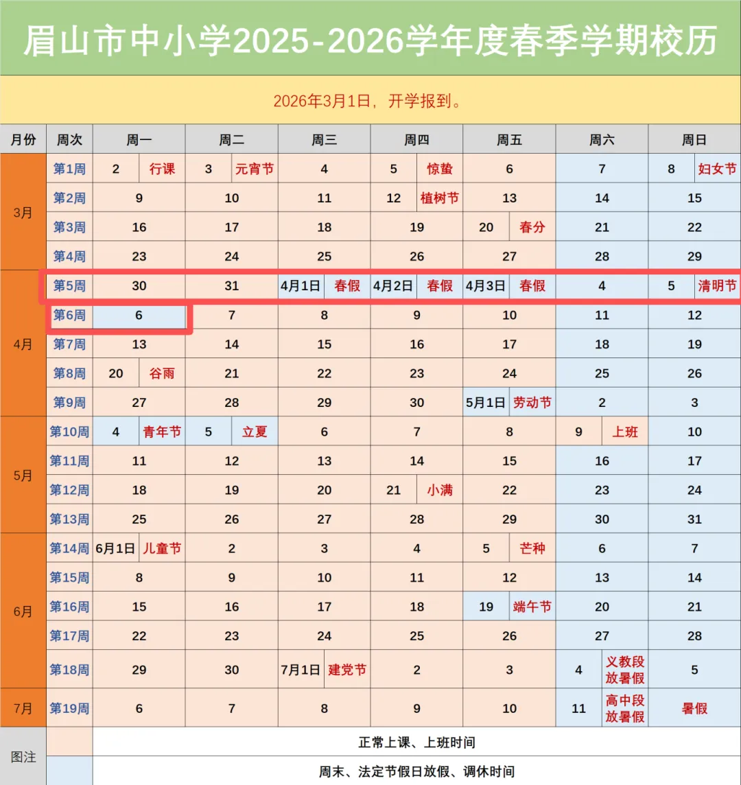 根据眉山教育体育公布的“眉山市中小学2025-2026学年度春季学期校历”,眉山明确春假将在清明节假期前开启,2026年春假为4月1日、2日、3日共计三天时间,与清明假连休,共6天假期。