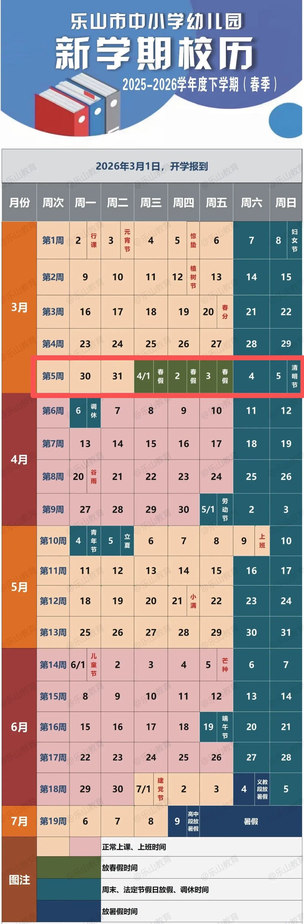 据乐山教育官方最新公布的“乐山市中小学幼儿园新学期校历”,全市幼儿园、中小学春假将于清明节假期前开始,2026年春假为4月1日、2日、3日共计三天时间,与清明假连休,共6天假期。