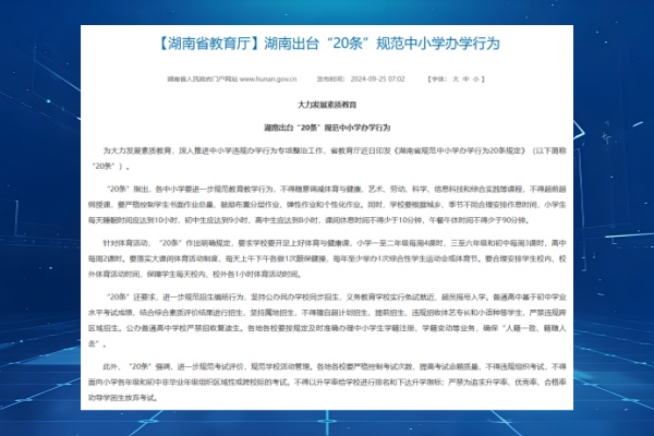近日,湖南省教育厅印发《湖南省规范中小学办学行为20条规定》,从进一步规范教育教学行为、招生编班行为、补课办班行为、学校活动管理、家校联系管理、加强违规办学行为治理等7个方面出台了20条规定,旨在深入推进中小学违规办学行为专项整治工作,提升基础教育治理能力。