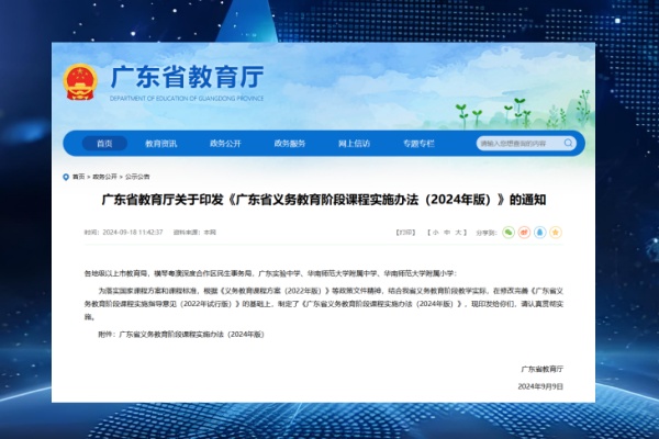 9月18日,广东省教育厅对外公布《广东省义务教育阶段课程实施办法(2024年版)》(以下简称《办法》)。《办法》提及义务教育阶段每学年共39周,新授课总课时数为9522。《办法》明确,义务教育课程包括国家课程、地方课程和校本课程三类。原则上,每门课程平均应有不低于10%的课时开展跨学科主题学习。学校要注重培养学生在真实情境中运用综合知识解决问题的能力。