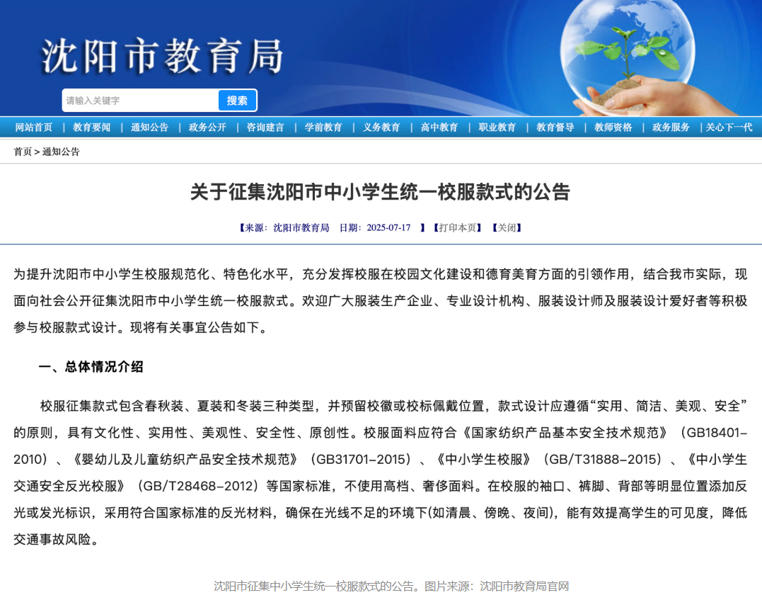 类似的,今年7月,沈阳市教育局也发布了《关于征集沈阳市中小学生统一校服款式的公告》。该公告表示,市教育局将通过公开征集、评审、公示等程序确定沈阳市中小学生统一校服款式,并通过官方网站发布。企业可依据发布的统一校服款式及面料,自主生产、销售,全市学生自愿选购。
