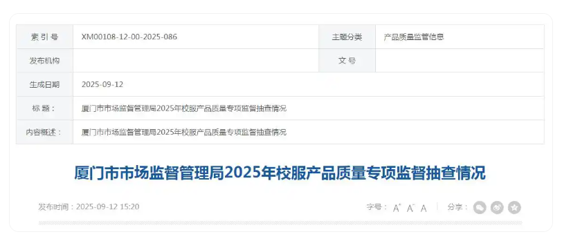 中国质量新闻网讯 据厦门市市场监督管理局网站消息,2025年,厦门市市场监督管理局组织抽查了校服产品60批次,其中涉及3家生产企业的6批次,34家销售门店(流通领域)的54批次。此次抽查依据GB/T 31888-2015 《中小学生校服》、GB 31701-2015《婴幼儿及儿童纺织产品安全技术规范》等要求,对校服产品的甲醛含量、pH值、可分解致癌芳香胺染料、耐水色牢度、耐酸汗渍色牢度、耐碱汗渍色牢度、耐干摩擦色牢度、耐湿摩擦色牢度、纤维含量、绳带要求、附件锐利性、金属针、絮用纤维原料要求等项目进行了检验。抽查结果:55批次合格,发现5批次不合格,不合格发现率为8.3%。具体抽查结果详见附件。