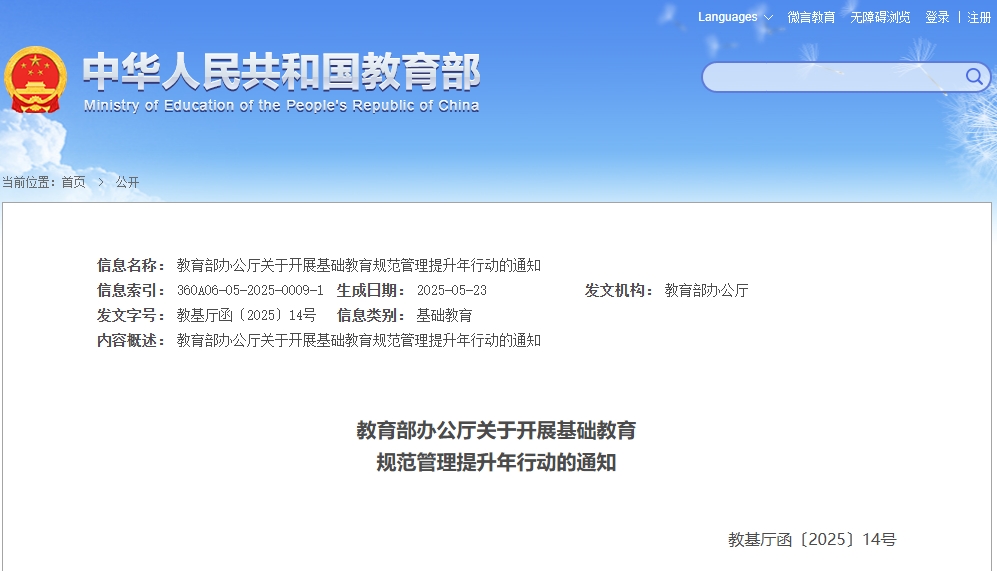 教育部办公厅发布关于开展基础教育规范管理提升年行动的通知。